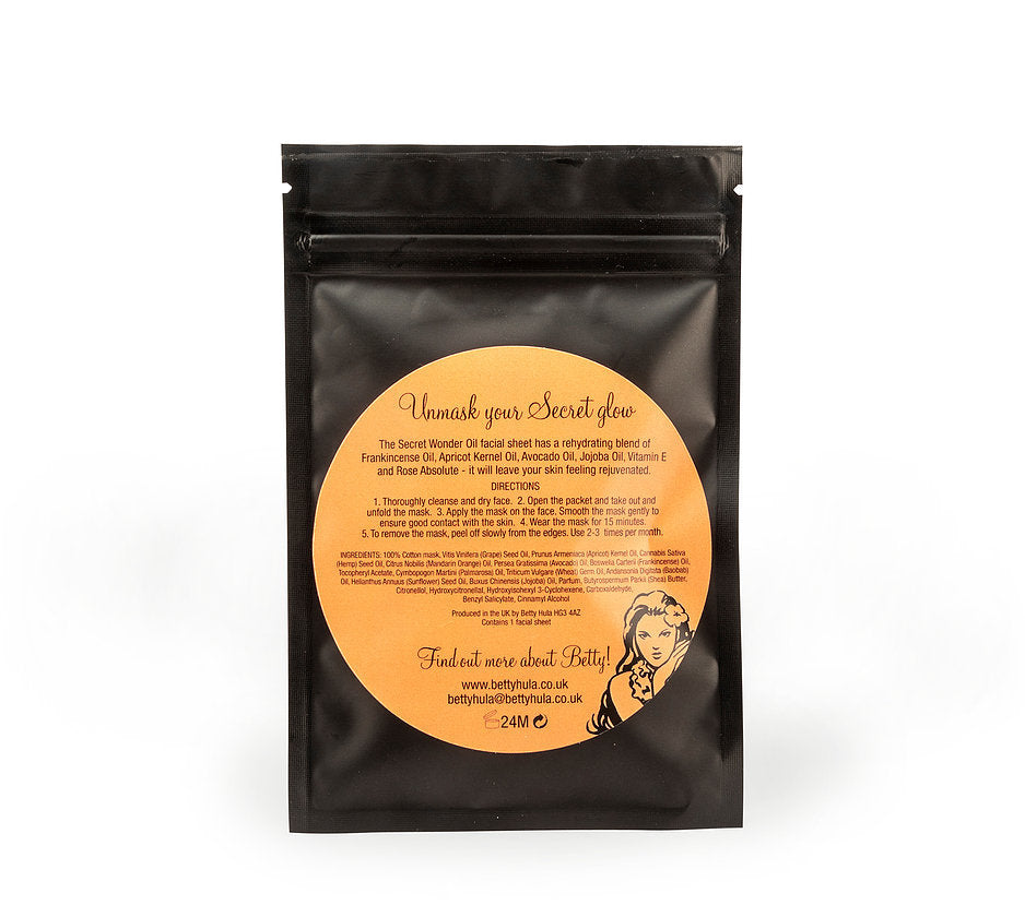 The Secret Wonder Oil facial sheet has a rehydrating blend of Frankincense Oil, Apricot Kernel Oil, Avocado Oil, Jojoba Oil, Vitamin E and Rose Absolute - it will leave your skin feeling rejuvenated.