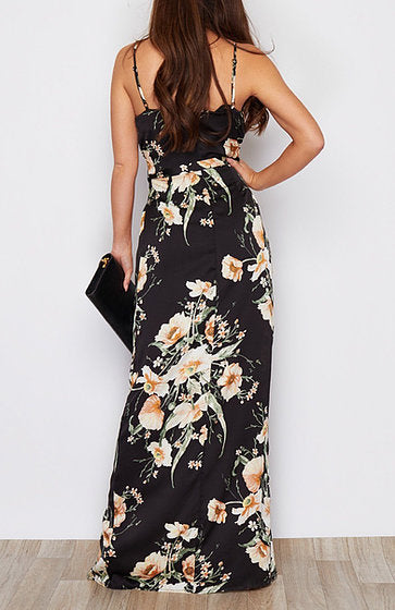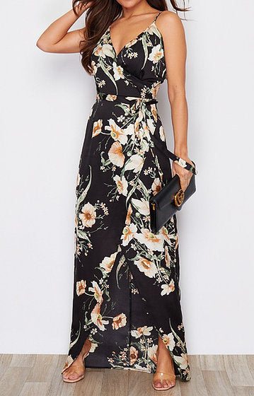 Look totally chic this season in this floral print maxi dress. This v neck wrap detailed dress is seriously figure flattering, with a tie belt and wrap front this dress will give you a standout silhouette. Pair with lace up heels for a classy finish.