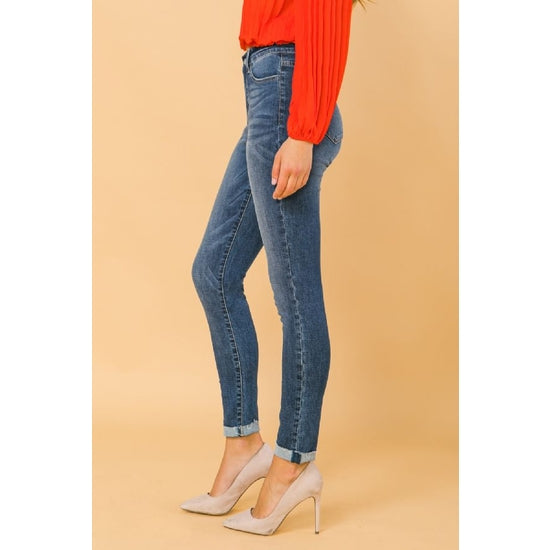 Denim pant featuring washed distressed front with raw edge cuffed bottom