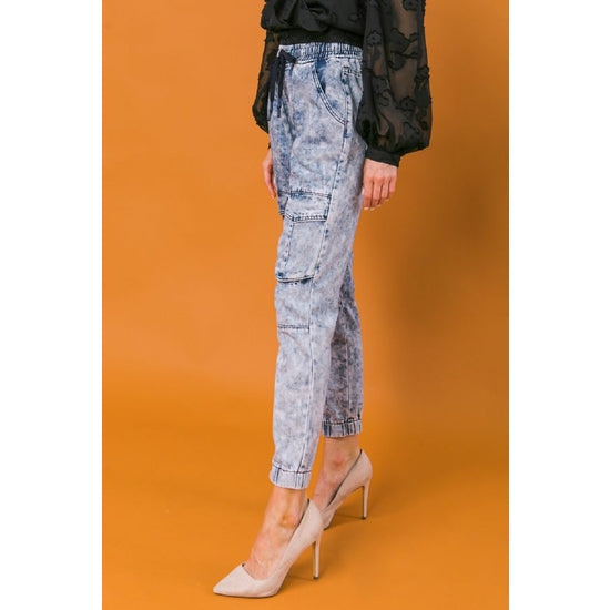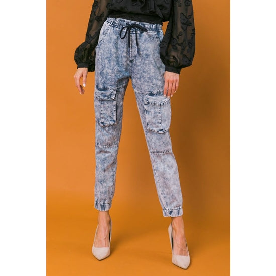 Jogger Denim featuring elasticised waist band, front tie, functional pockets and elasticised bottom