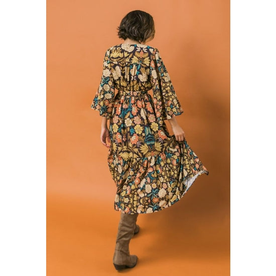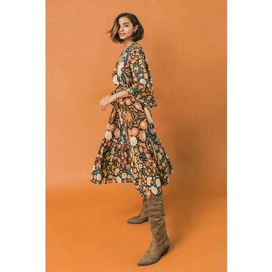 A printed woven midi dress featuring surplice neckline, 3/4 angel sleeve, elasticised waist, self sash tie and ruffled hemline