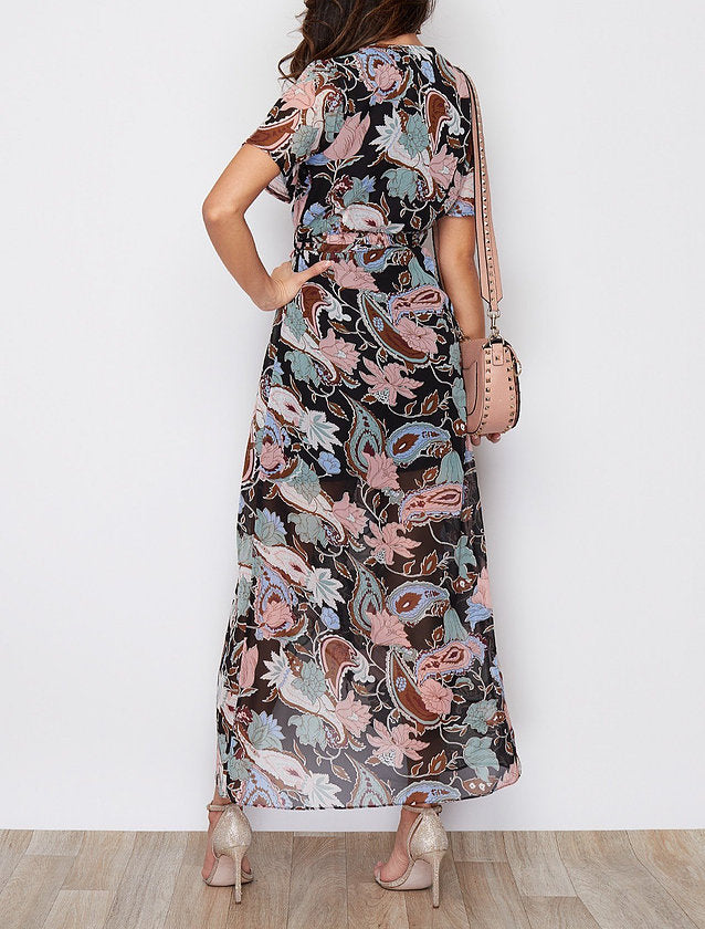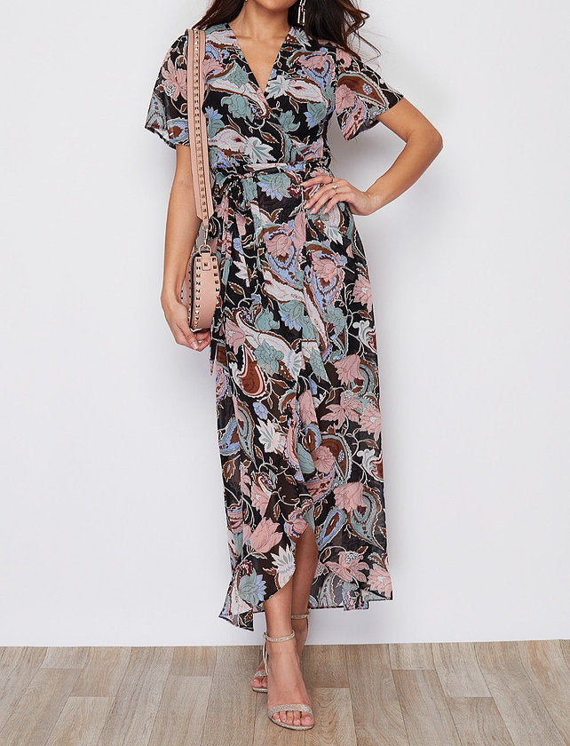 This gorgeous wrap maxi dress featuring frill slit hem detailing is in a stunning paisley print. Pair with wedges and a cute shoulder bag for that casual glam, or dress up with heels for an evening meal.