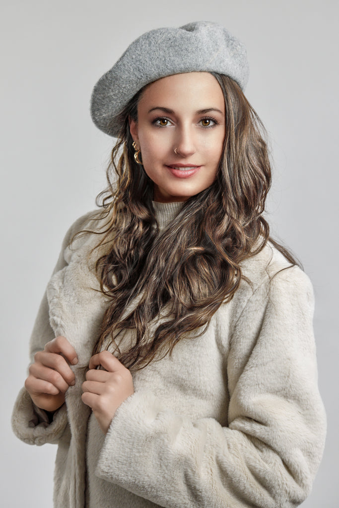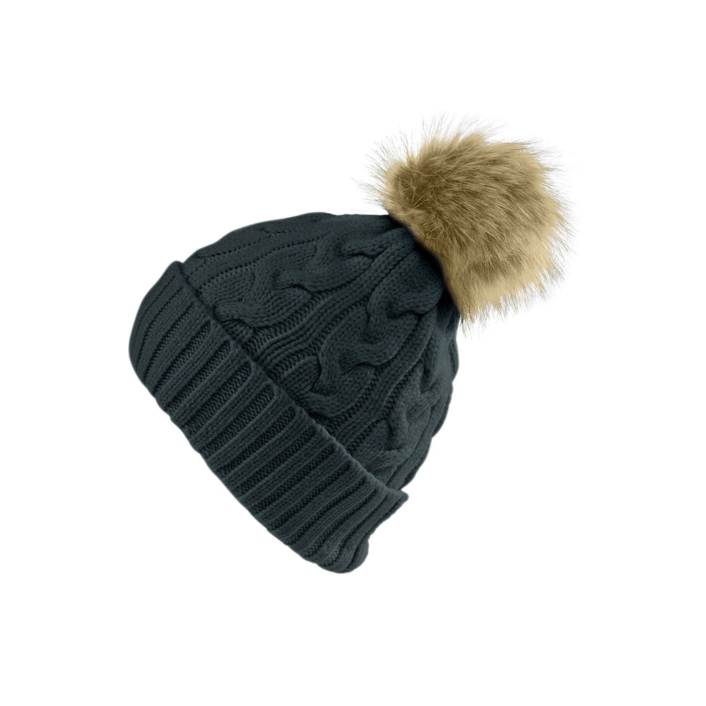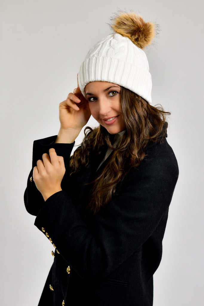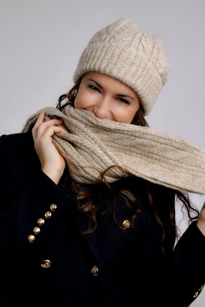 Warm Knitted Hat with Braided Pattern in Light Grey
