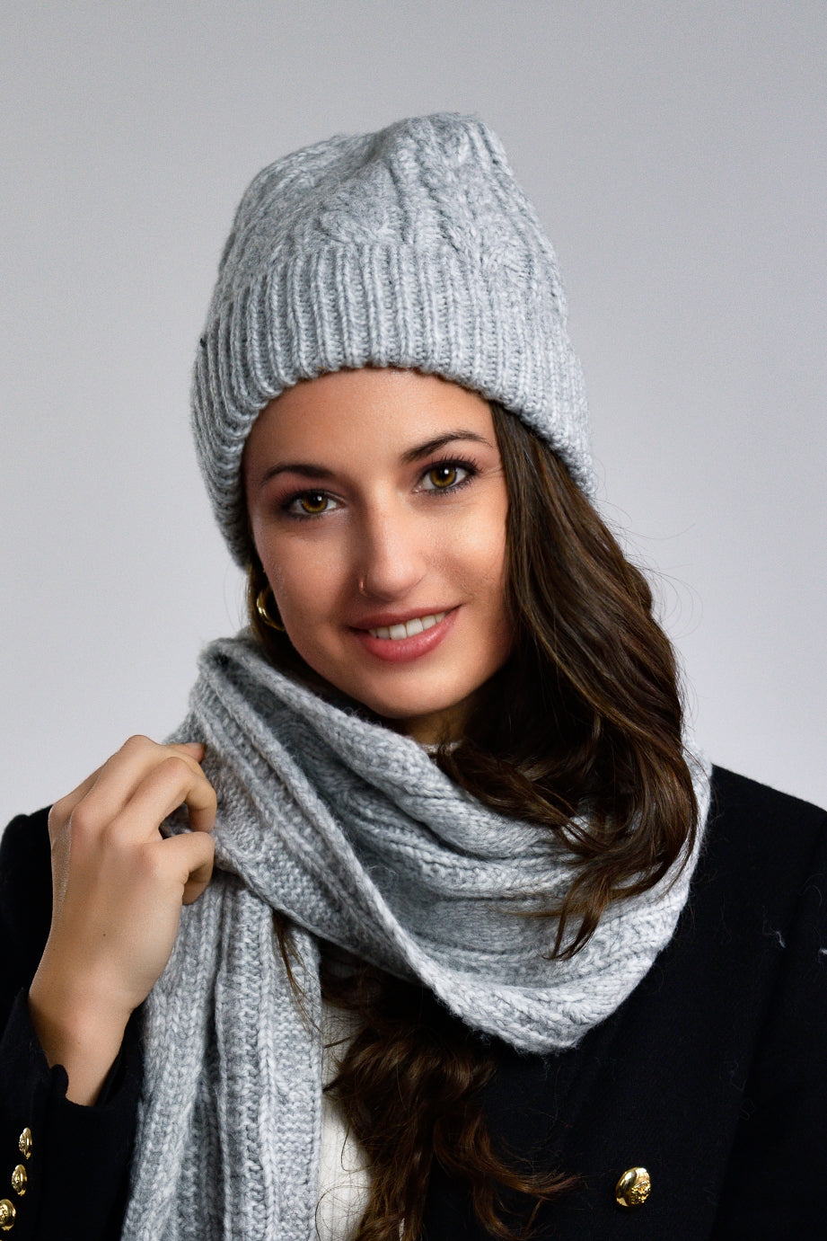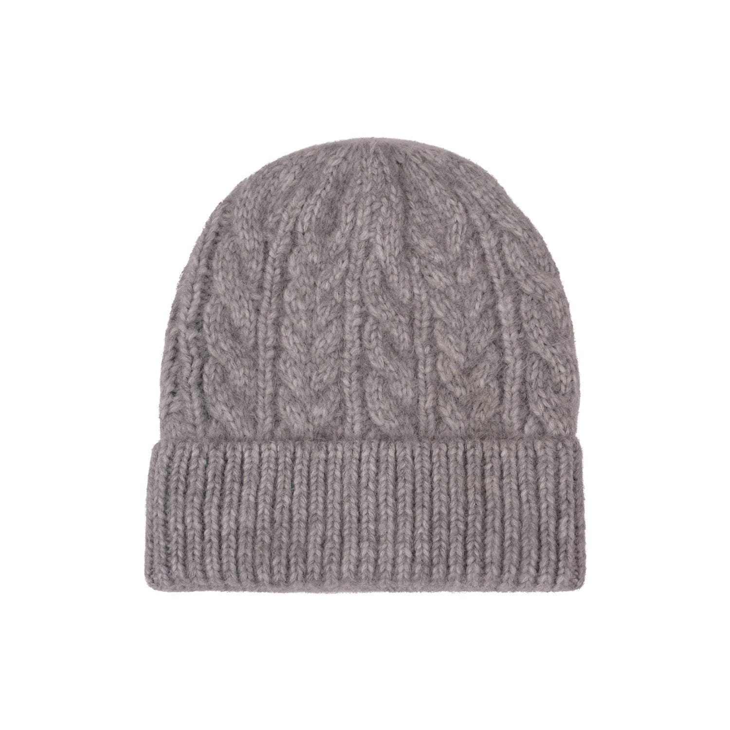 Warm Knitted Hat with Braided Pattern in Light Grey