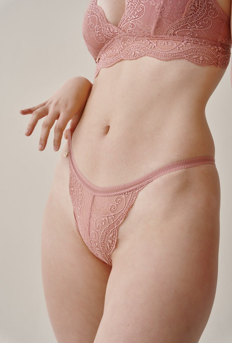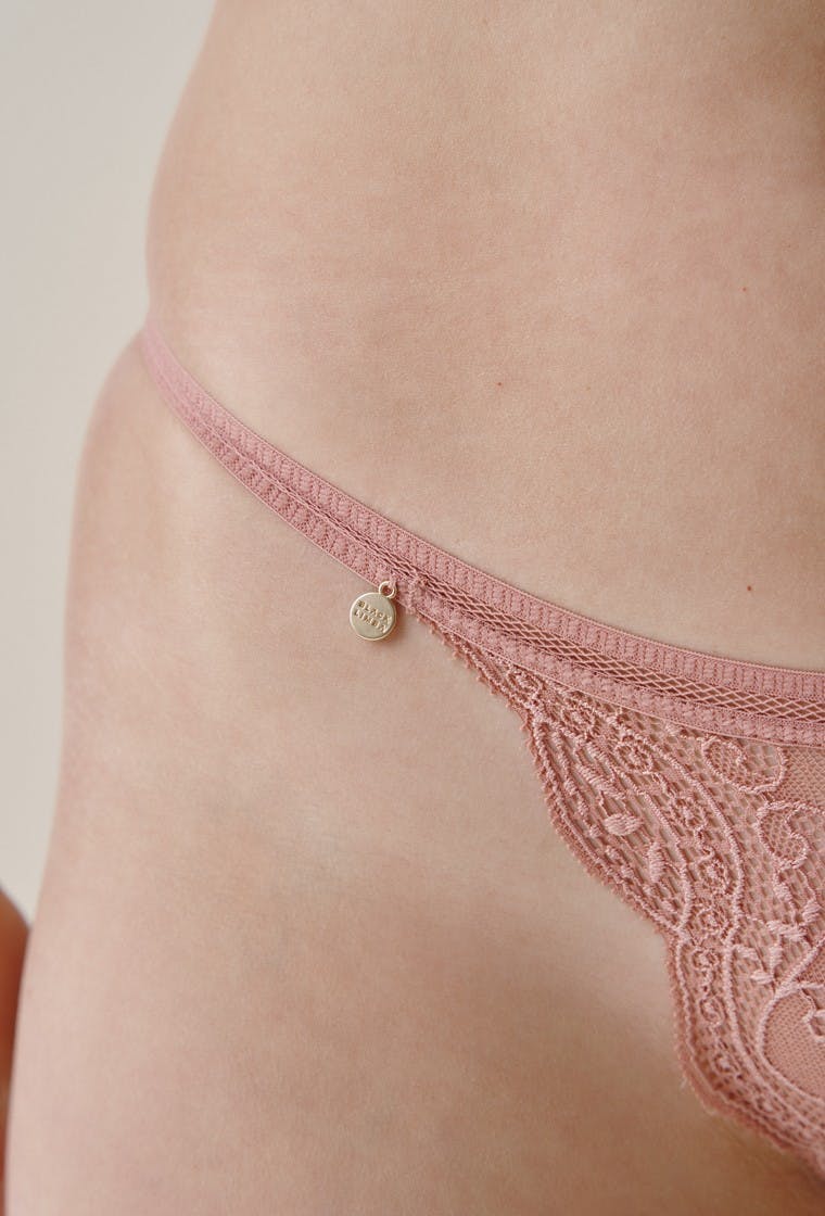 Brazilian brief in semitransparent fabric with bound edges. Thin and elastic rubber waistband that fits loosely.