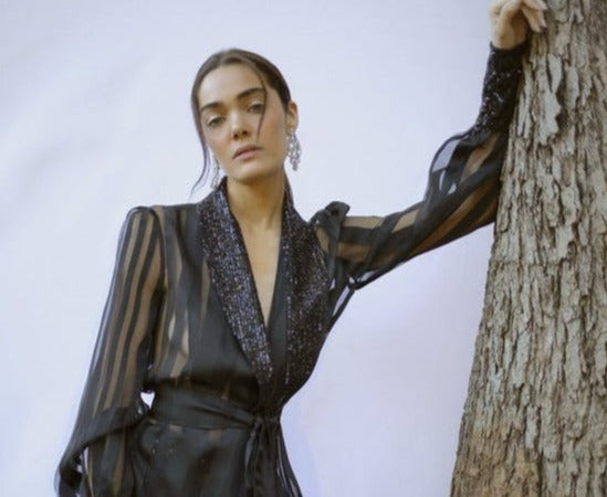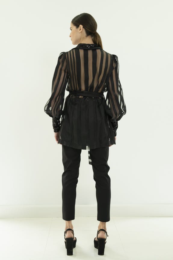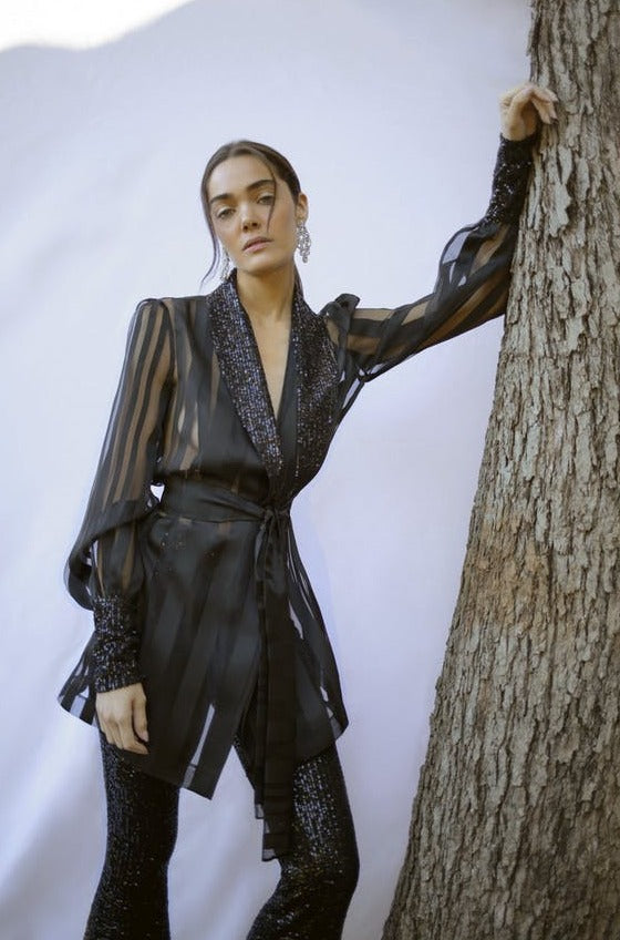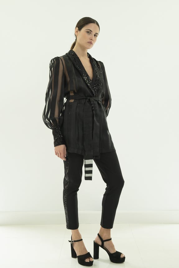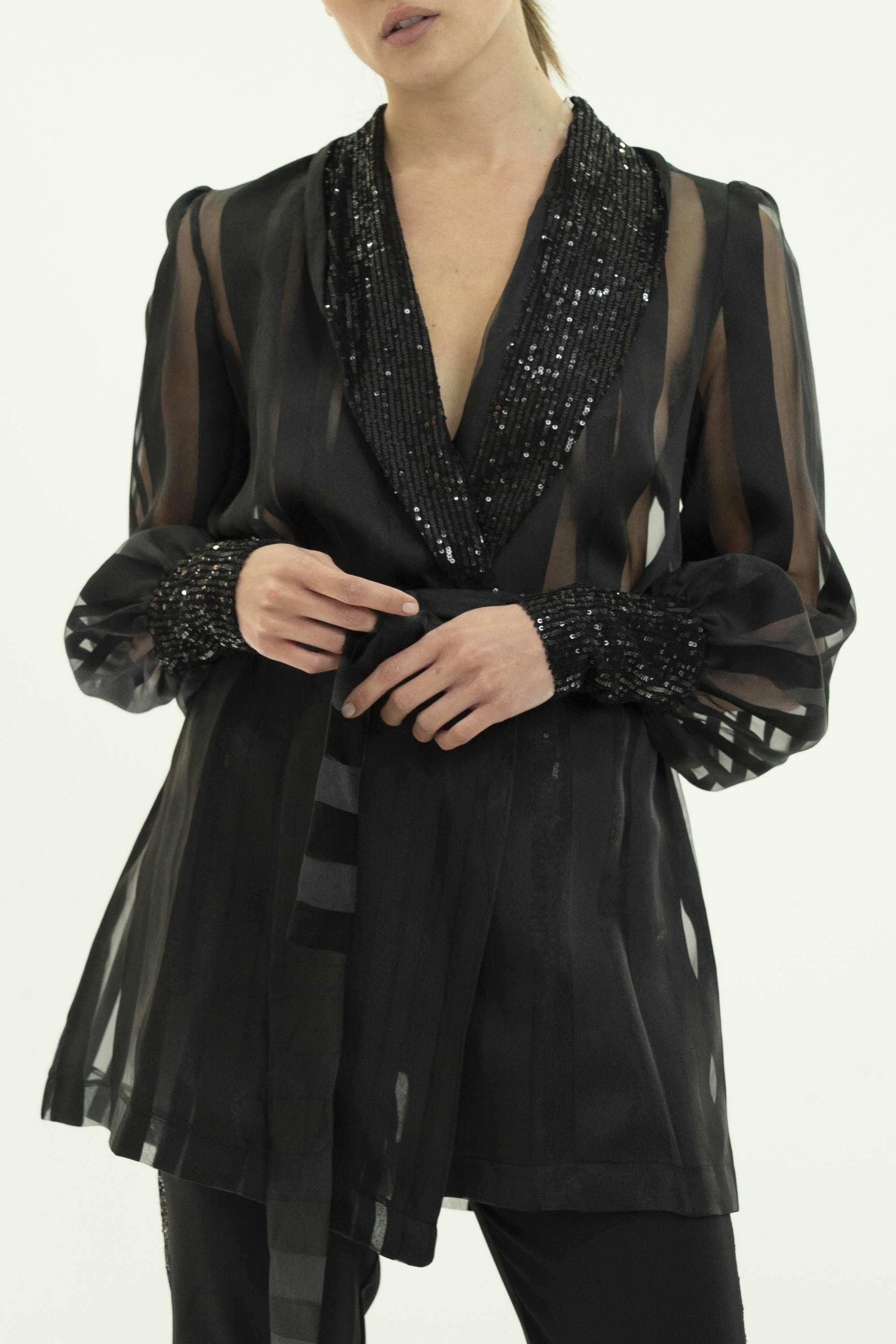 Chiffon and satin blazer with sequin lapels and cuffs, crossed with belt. A versatile and elegant garment.