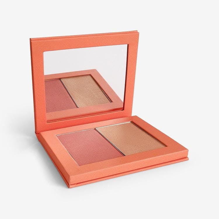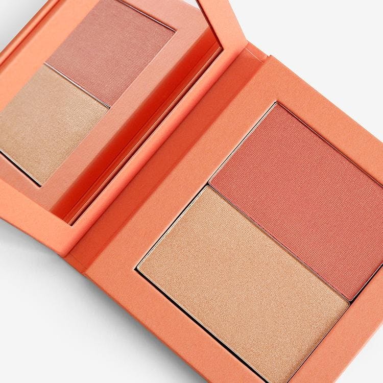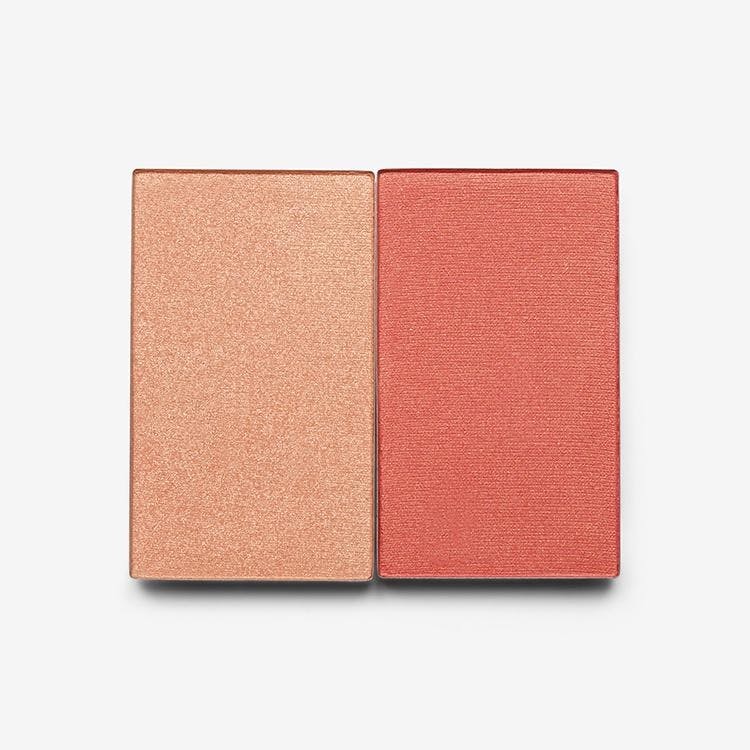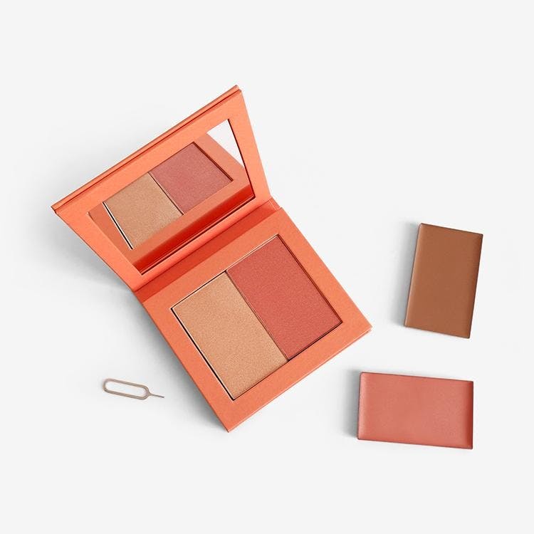 This travel-friendly, refillable palette contains our bestselling powder blush and highlighter duo to add warmth and radiance to your skin in two quick steps. Add colour to your cheeks with a swirl of blusher, then finish by dusting highlighter onto the high points of your face. Our easy-to-use refill system means that when your pans are used up, you can simply swap in a fresh one. Just push the provided pin through the hole at the back of the palette until the used makeup pan pops out. Insert the new pan and recycle the old one!