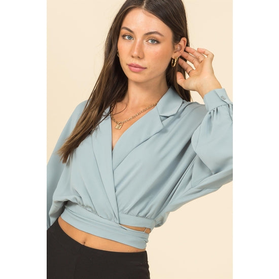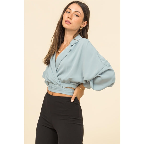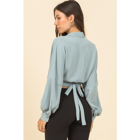 Drop Shoulder Wrap Tie Back Blouse in Sage