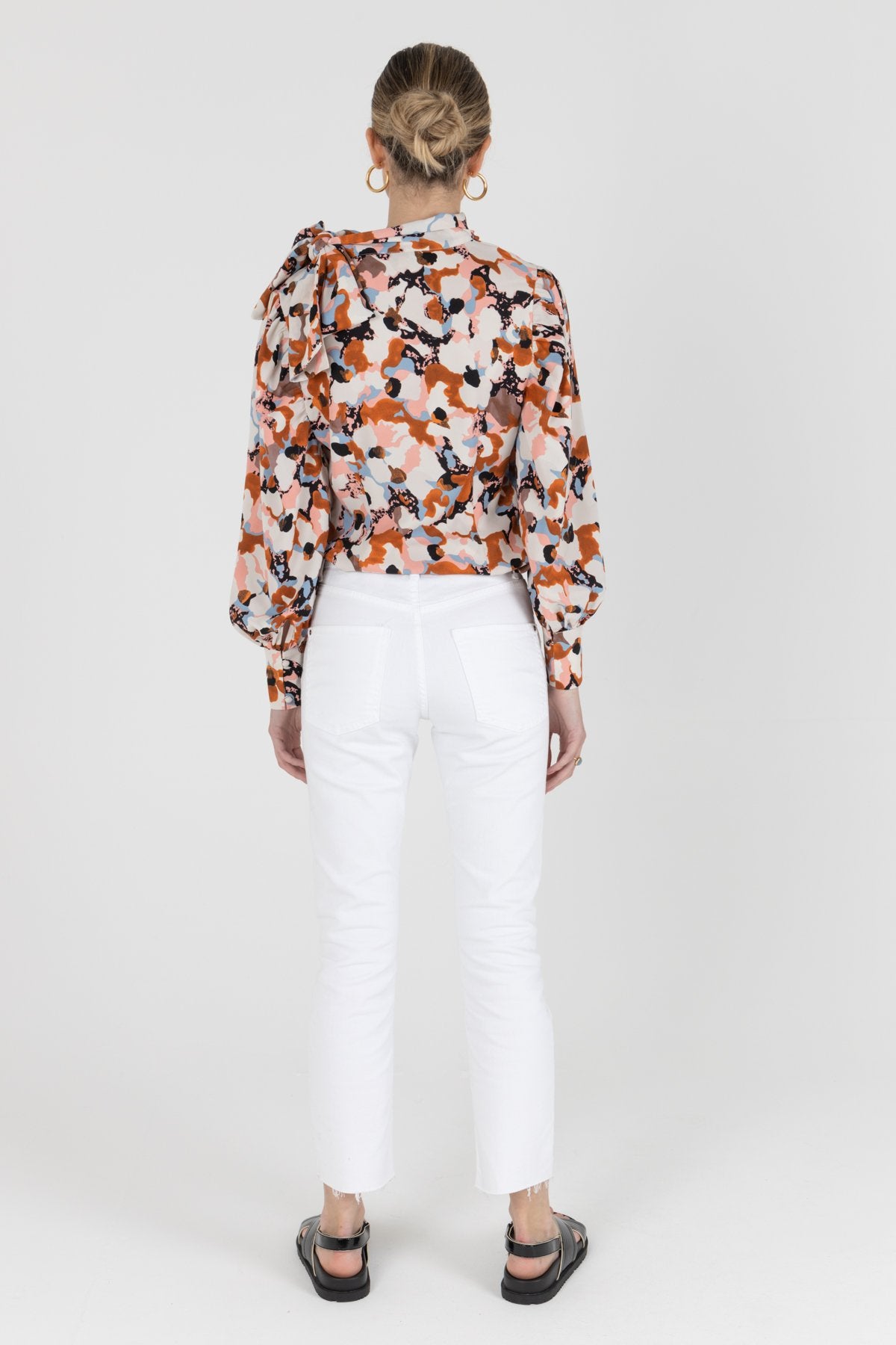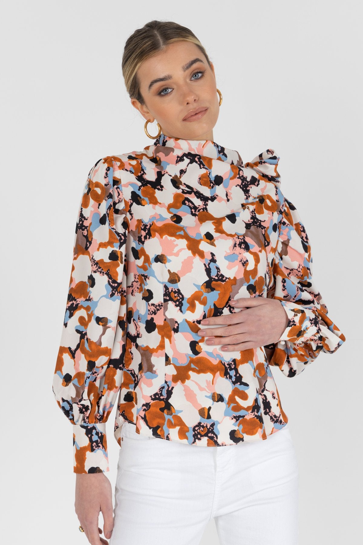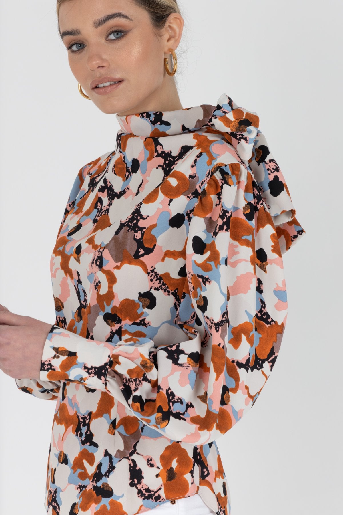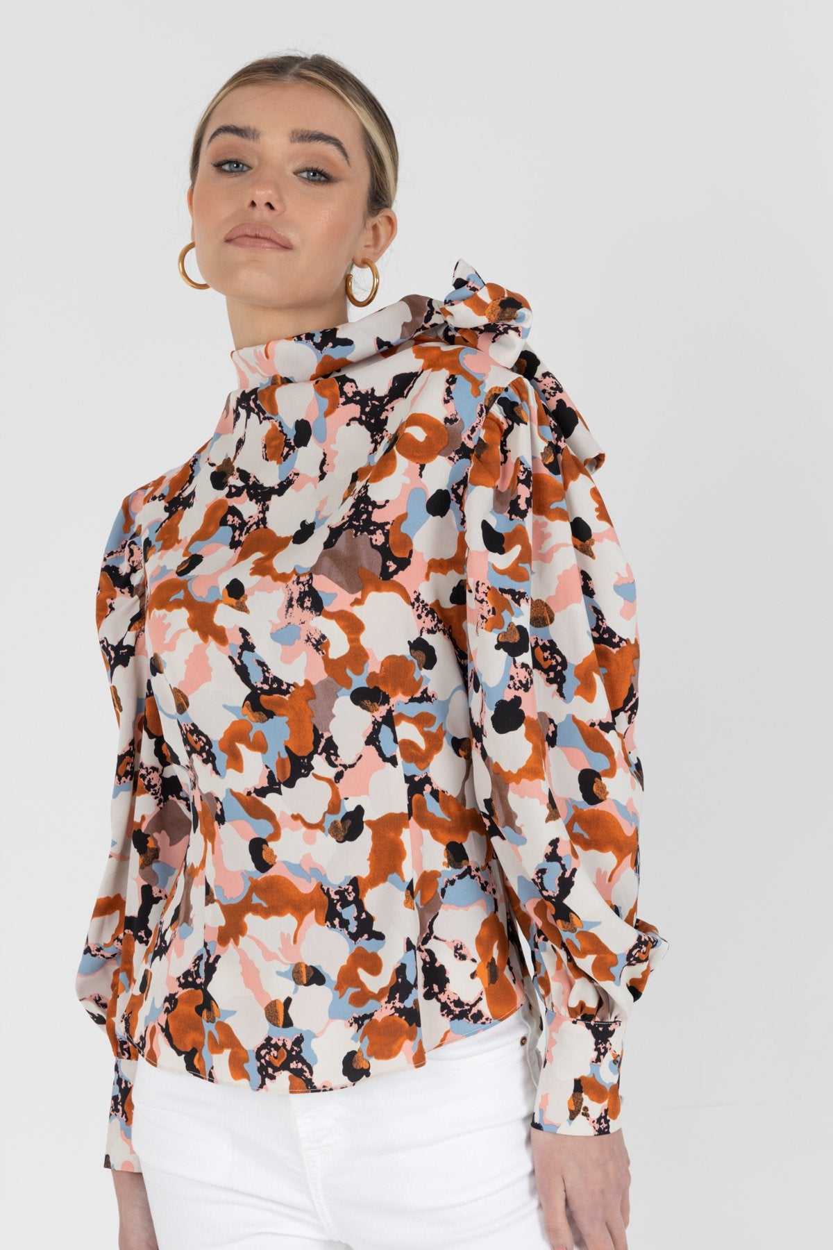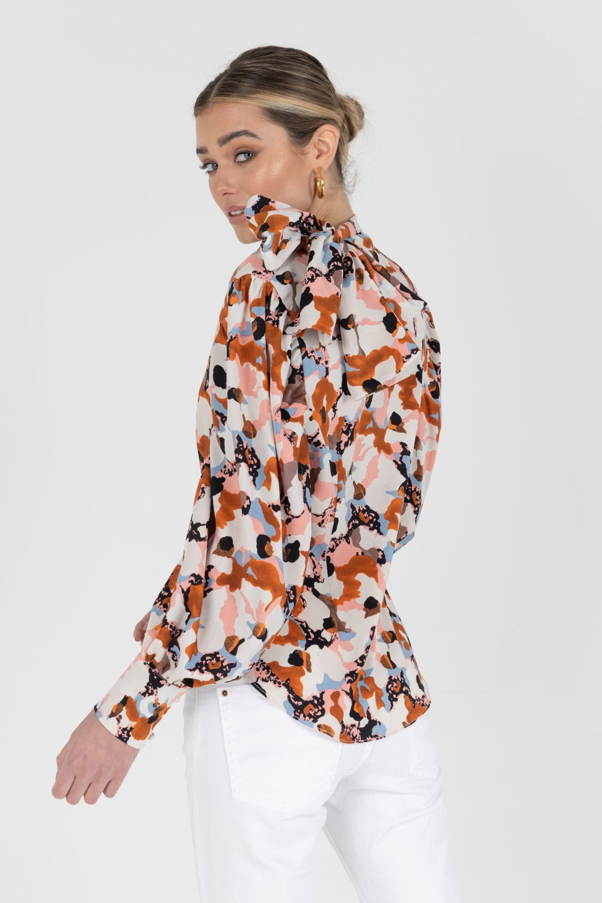 Fitted pussy bow blouse. Maxi long sleeve multicoloured blouse.
