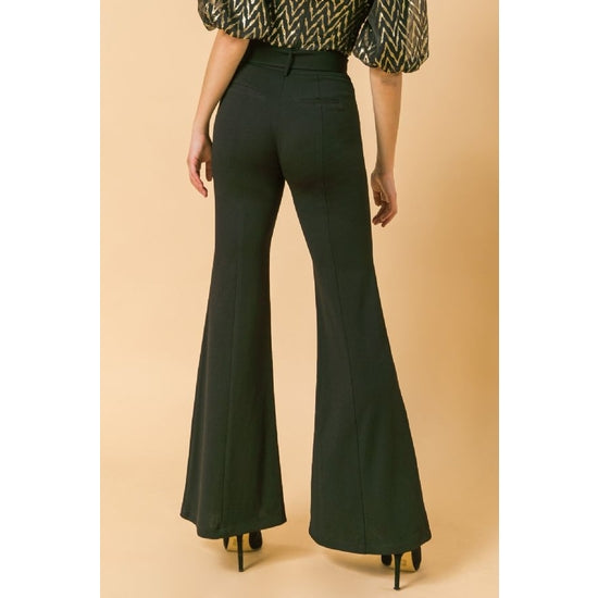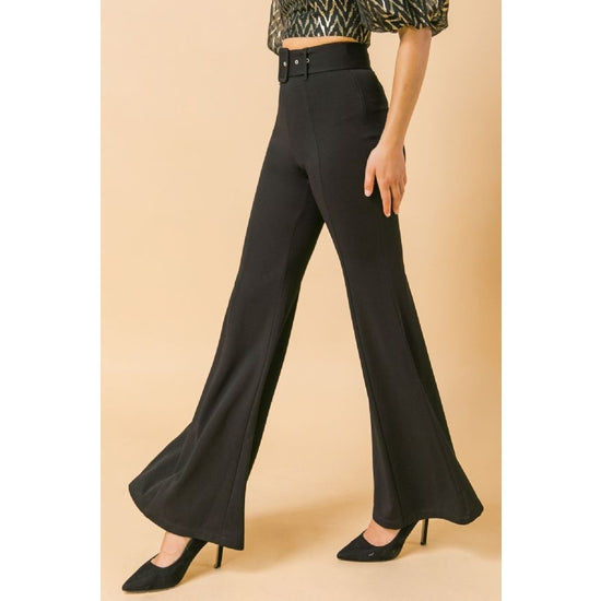 A solid woven flared trouser featuring bell bottom, self belt with rectangular buckle, and side pockets