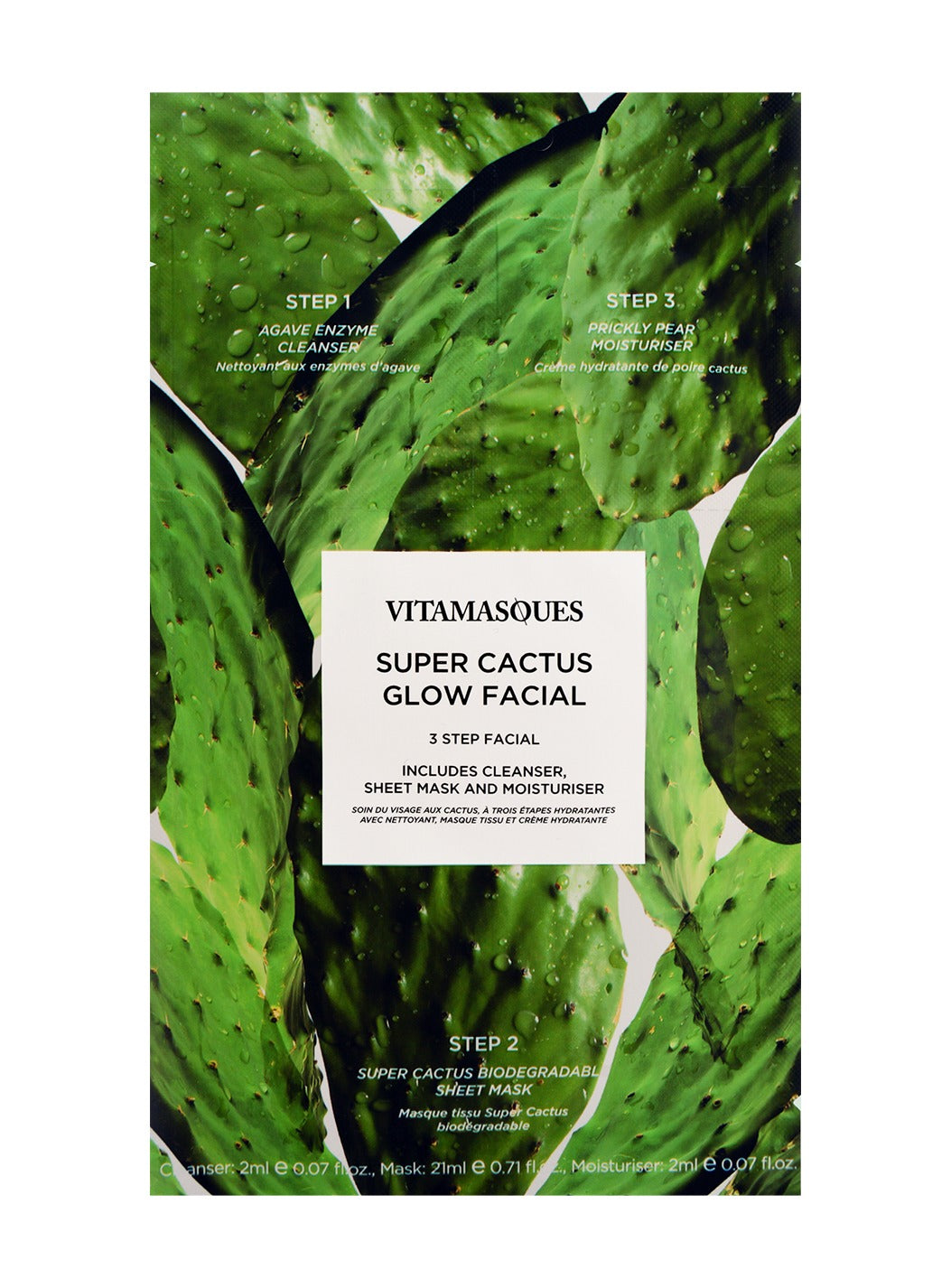 In the next step, you will open a natural, biodegradable sheet mask, infused with Cactus extracts and Vitamin C, AHA, BHA and PHA to improve your skins natural glow.