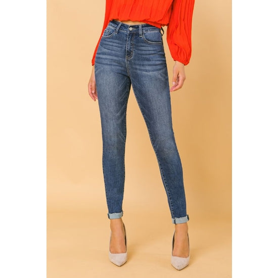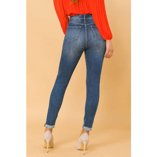 Denim pant featuring washed distressed front with raw edge cuffed bottom