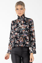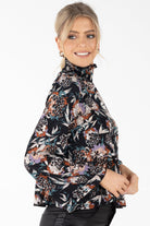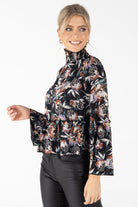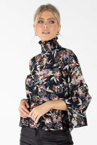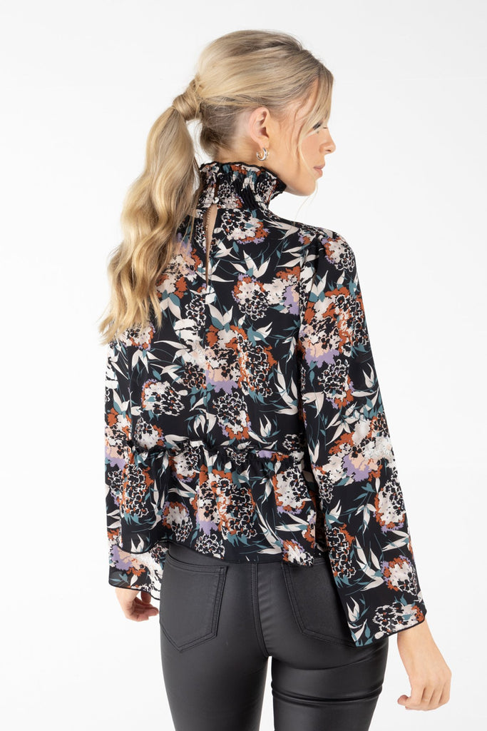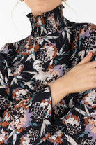 High shirred neck blouse. Dark / Black floral printed blouse. Wide maxi sleeves must have of the season.