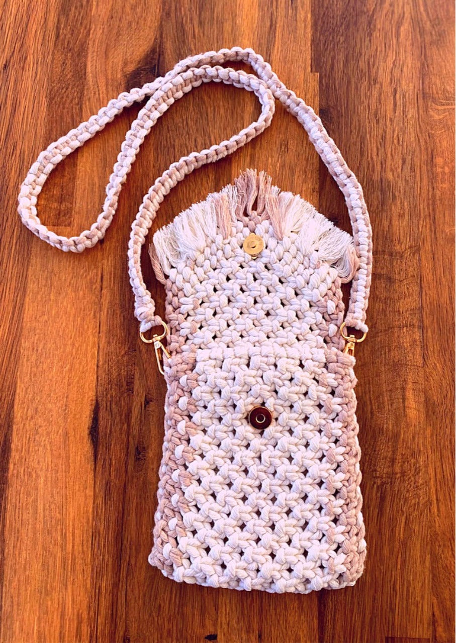 This Macrame phone pouch will keep your phone and a small card case easily. Elevate your daily essentials with this light weight and functional phone pouch.