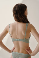 Crop top style bralette with trimmed edges and lace at the waist. Pronounced and flattering V-neckline. Cups with removable foam and lining to avoid transparency. Wide adjustable strap and back closure for a better fit and comfort.