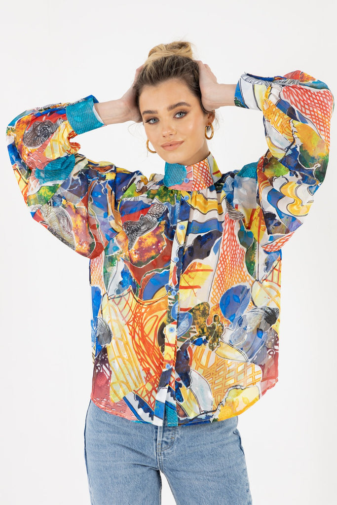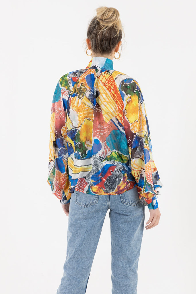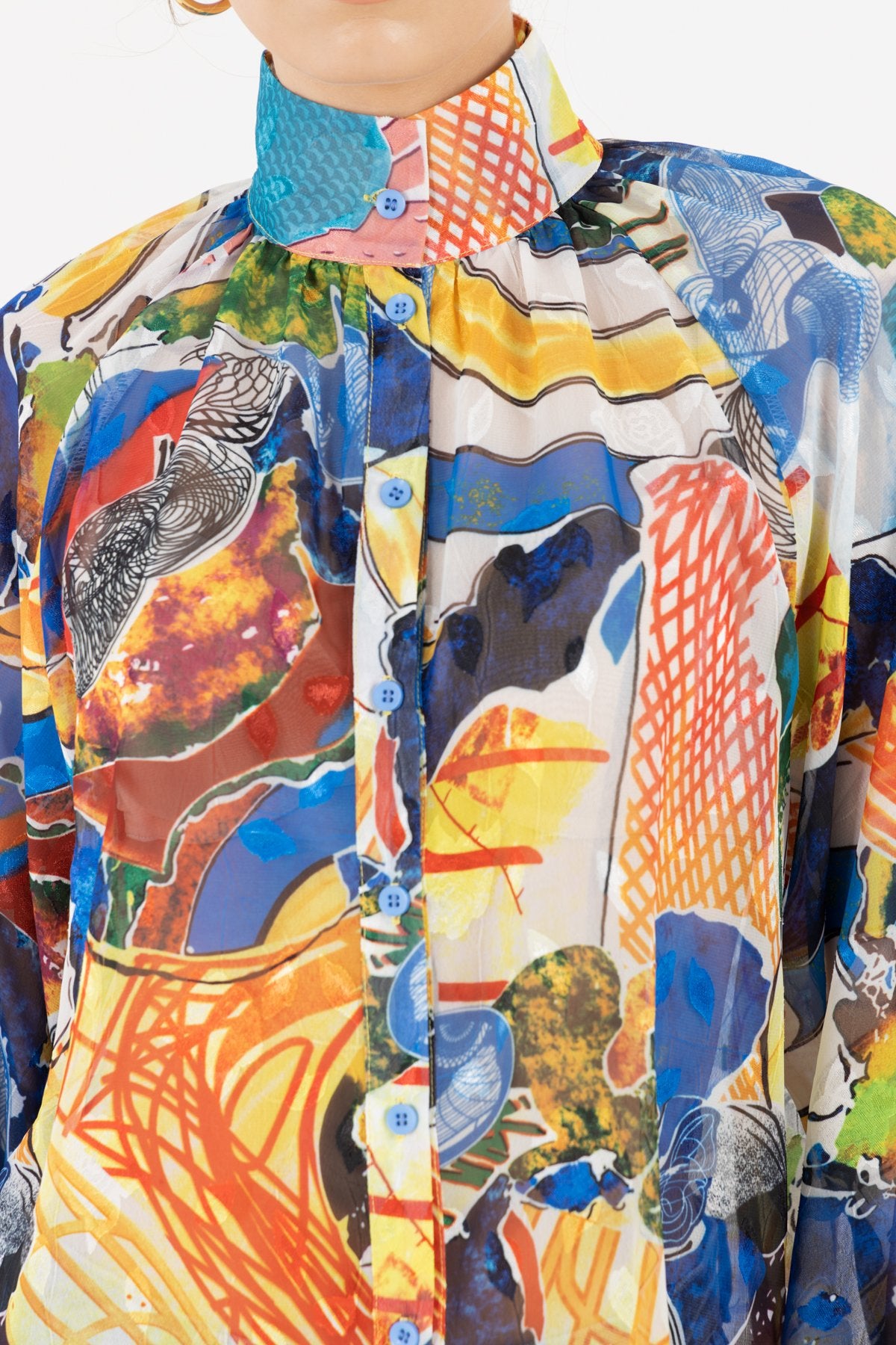 Blue and yellow conversational chiffon printed shirt with high round neck.