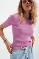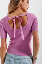 Pink fine-knit canale sweater with knotted detail on the back and short sleeves