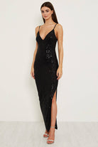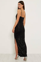 A black all-over stretch sequin maxi dress with a flirtatious strap.