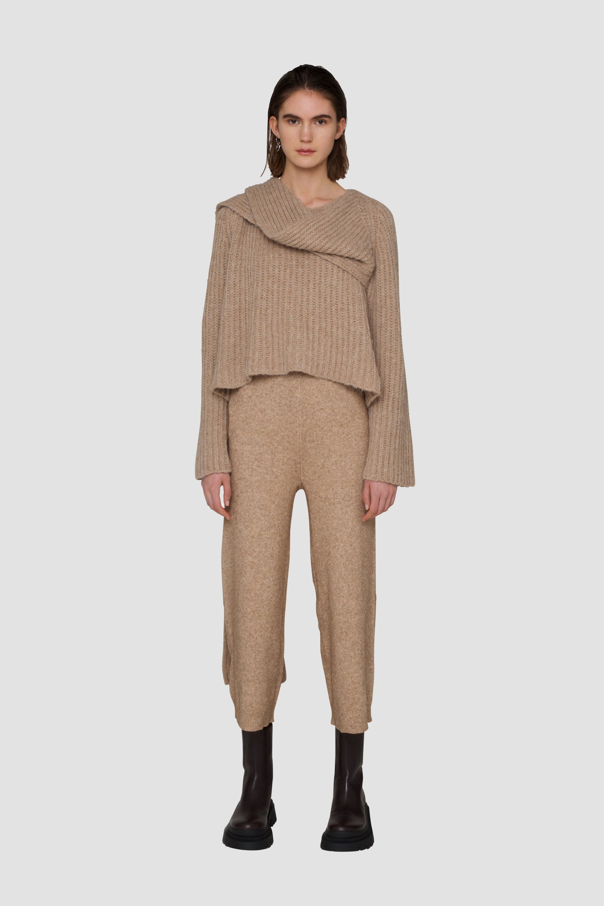 Loose-fitting chunky knit with oversize neck tie detail. A slightly cropped length sits on the waist.