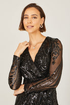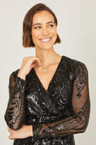 The all over sequins add the drama all season long in this midi dress from Yumi. The swirling design gives a luxurious feel. The long sleeves, fitted waistline, wrap over neckline and midi length all make for a stunning design. Wear this to any invite over the festive season.
