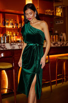 Green Velvet Frill One Shoulder Midi Dress With Split Hem