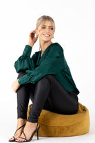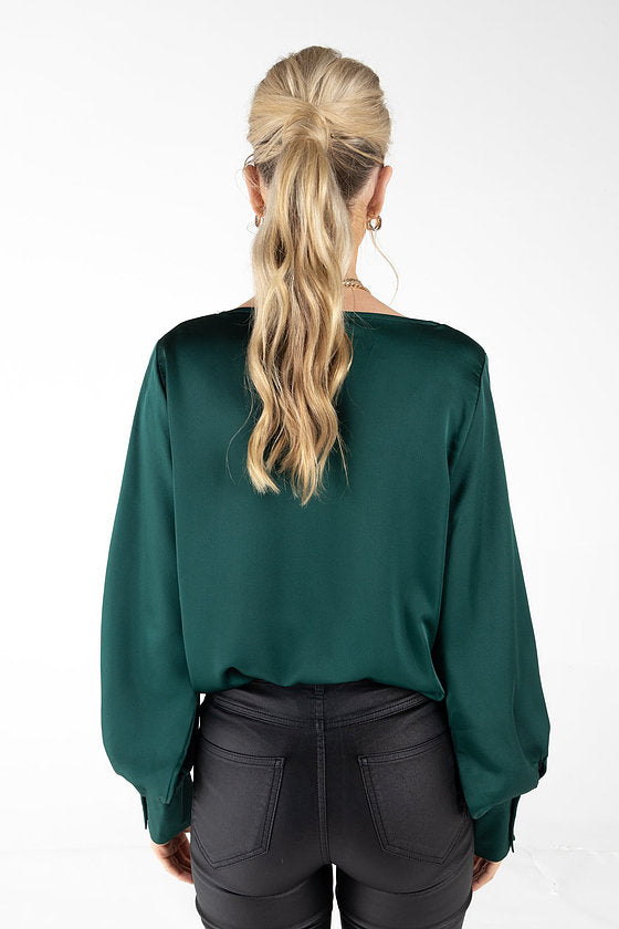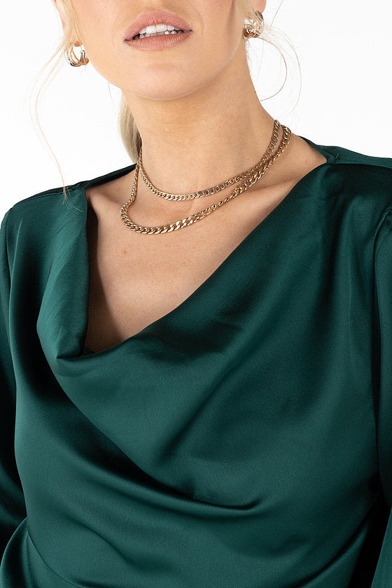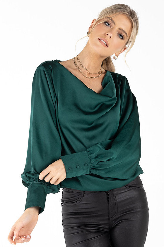 Cowl neckline and maxi sleeve green satin blouse. Long cuffs with button detail.